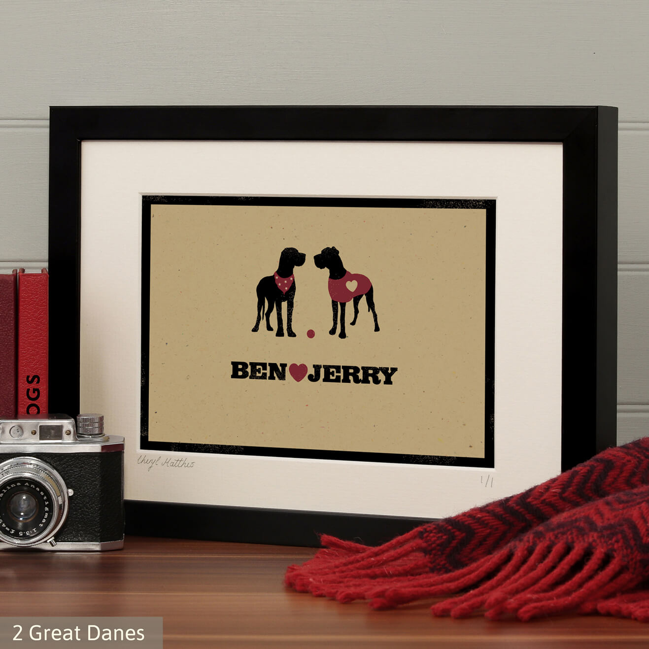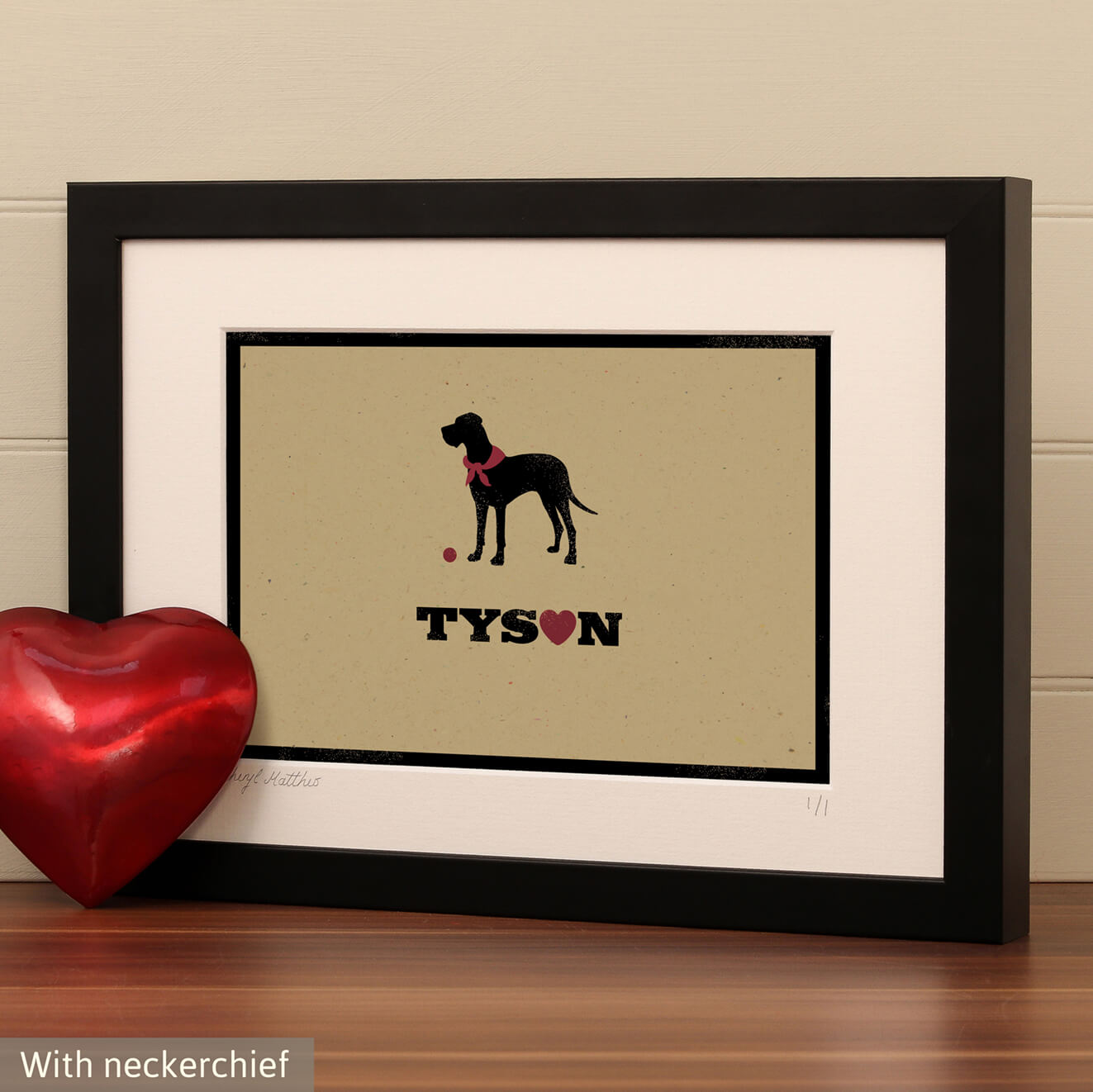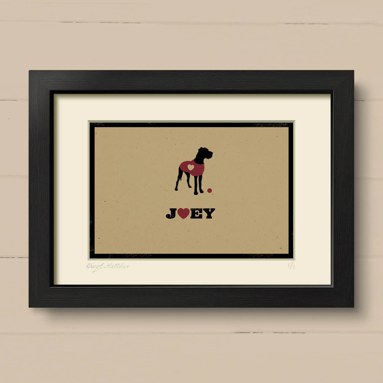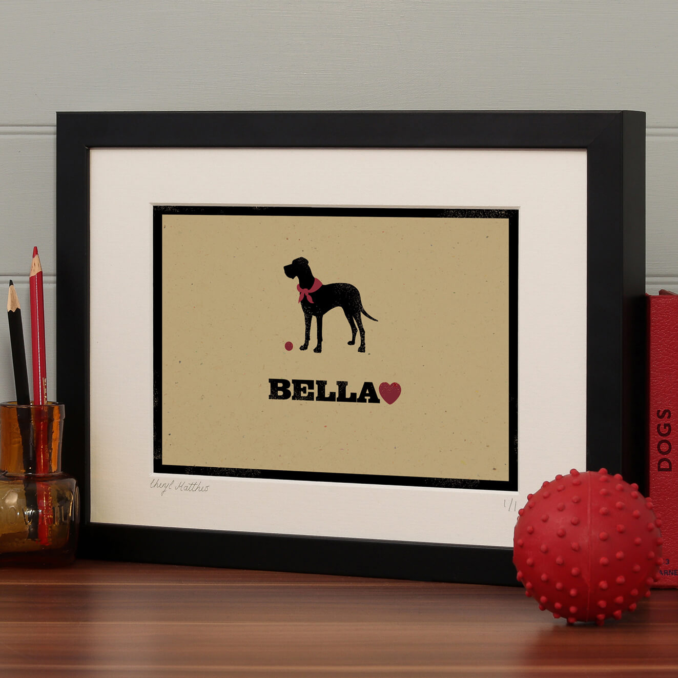 Celebrate this gentle and loving dog breed with our personalised Great Dane silhouette. This unique dog breed print is the perfect gift for dog lovers with the Great Dane’s name beautifully crafted with a heart.