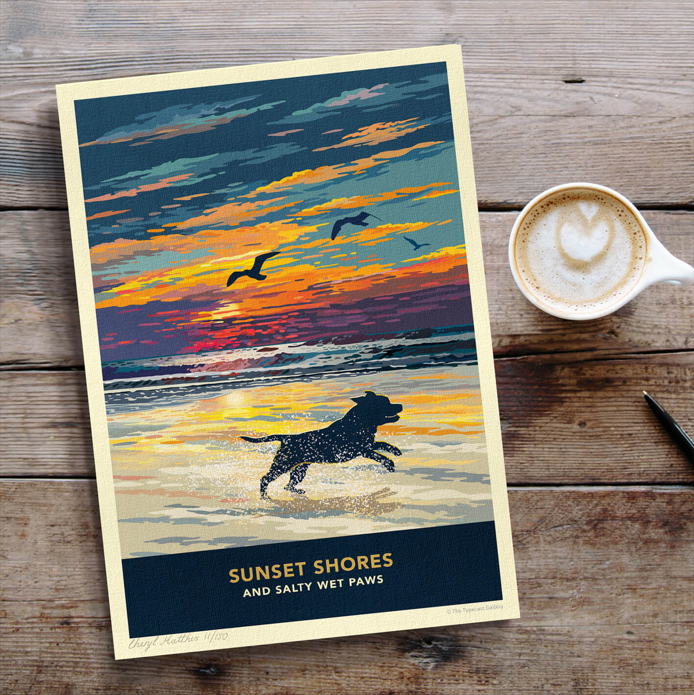 A unique Seaside Print suitable for many gifting occasions. Perfect for friends and their much-loved pets, an original housewarming present and a delightful birthday gift from the dog to its owner. An ideal gift for Mum at Christmas or for Dog Dads on Father’s Day.